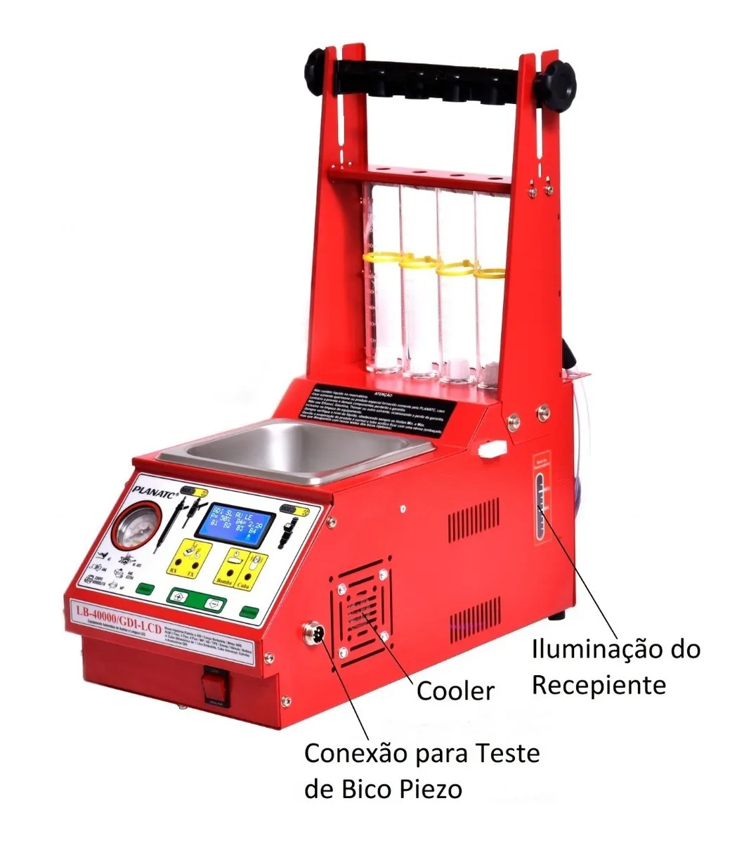 Máquina de limpeza de Bico Padrão para 4 bicos com display digital de LCD, GDI Solenóide (bico indutivo) e GDI Piezo Elétrico com pulso (RPM) progressivo, funções já estão implantadas no equipamento, para algumas funções é necessário adquirir o módulo ou acessório opcional para efetuar os testes dos mesmos.